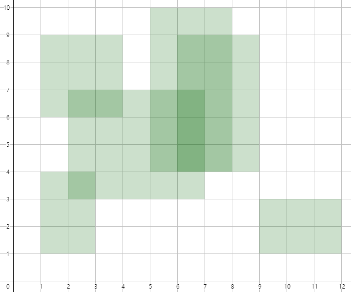 X[i]의 범위는 y좌표 y lower cor ~ y upper cor까지의 범위입니다.X[0] X[1] X[2] X[3] X[4] X[5] X[6] X[7] X[8] X[9] X[10] X[11] x cor 1 1 2 3 4 5 6 7 8 9 9 12 open/close 1 1 1 0 0 1 1 0 0 0 1 0 y upper cor 4 9 7 4 9 10 9 7 10 9 3 3 y lower cor 1 6 3 1 6 4 4 3 4 4 1 1 그럼 계산을 위한 모든 준비는 끝난겁니다.