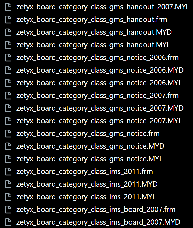 서버 내에 있는 데이터를 뜯어보니 .frm .MYI .MYD가 가득했다. 검색해보니 과거에 쓰이던 MySQL 파일 형식이라고 한다. .frm에는 말그대로 frame과 관련된 정보, .MYI에는 index 정보, MYD에는 data 정보가 들어있다고 한다.