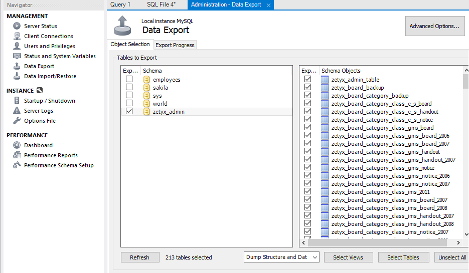 본인은 데이터베이스 이름을 zetyx_admin으로 만들어서 데이터베이스 이름이 zetyx_admin으로 뜬다. 그리고 데이터를 export한다. workbench 기준으로, USE restore; 명령어를 실행시키면 좌측에 "Data Export", "Data Import/Restore"이라는 항목이 생겼을 거다. Data Export를 클릭해서 GUI로 손쉽게 테이블들을 .sql로 내보낼 수 있다. 대충 체크할 거 다 체크하고, 입력창에다가 export 경로 지정하고, 버튼만 누르면 된다.5 cli로 하고 싶다면 이 Shell 문서를 참고하자.