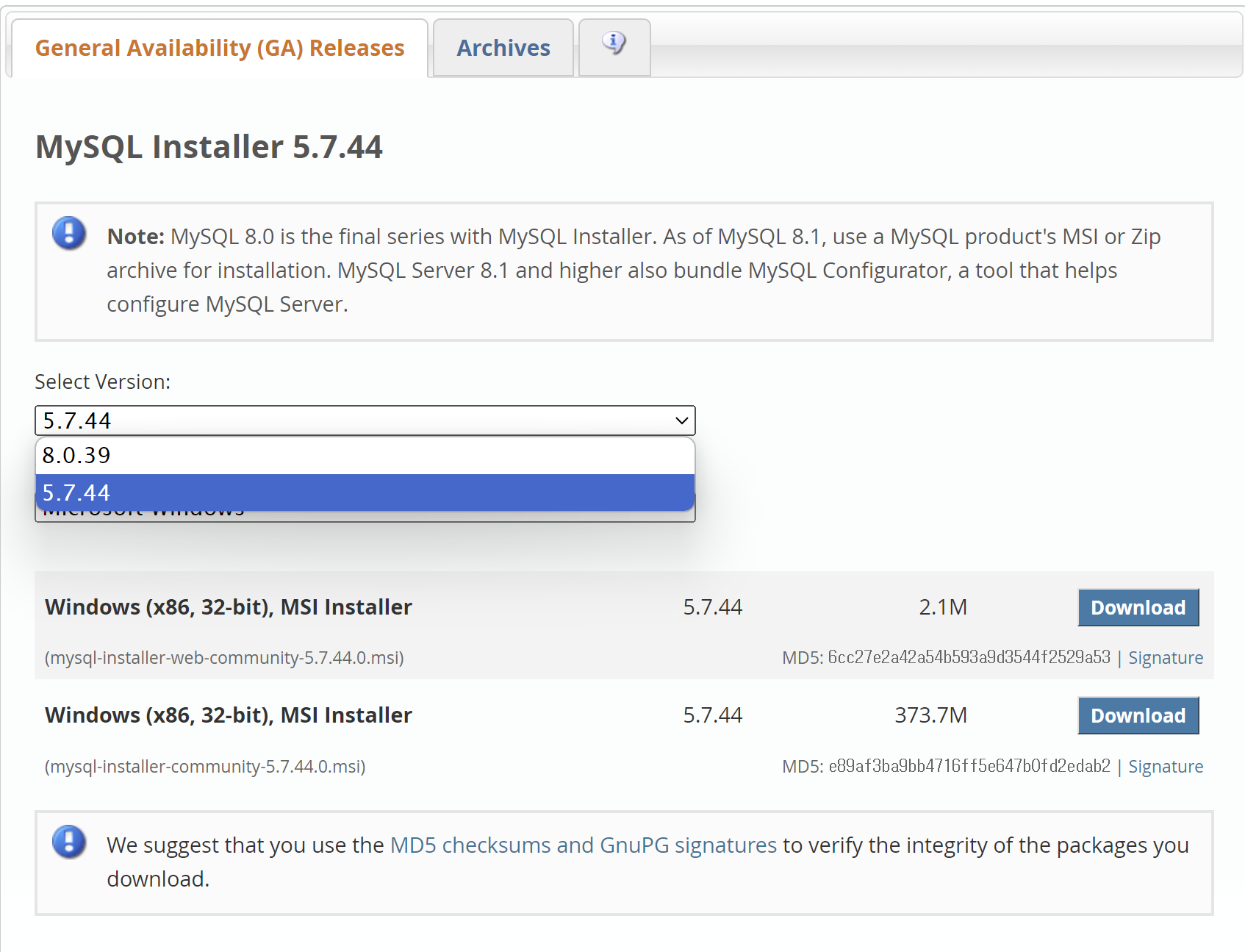 복구를 위해 먼저 MySQL installer 웹페이지 에서 MySQL을 다운받는다. 이때 주의할 것이, 5.7을 다운로드 해야한다. .MYD는 이미 최신 버전에서는 사용되지 않는 파일 형식이기 때문에, 원활한 사용을 위해서는 5.7을 다운로드 하는 것이 좋다. 잘 모르겠으면 혼공학습단 웹사이트에 설명이 써 있으니 이걸 보고 하자