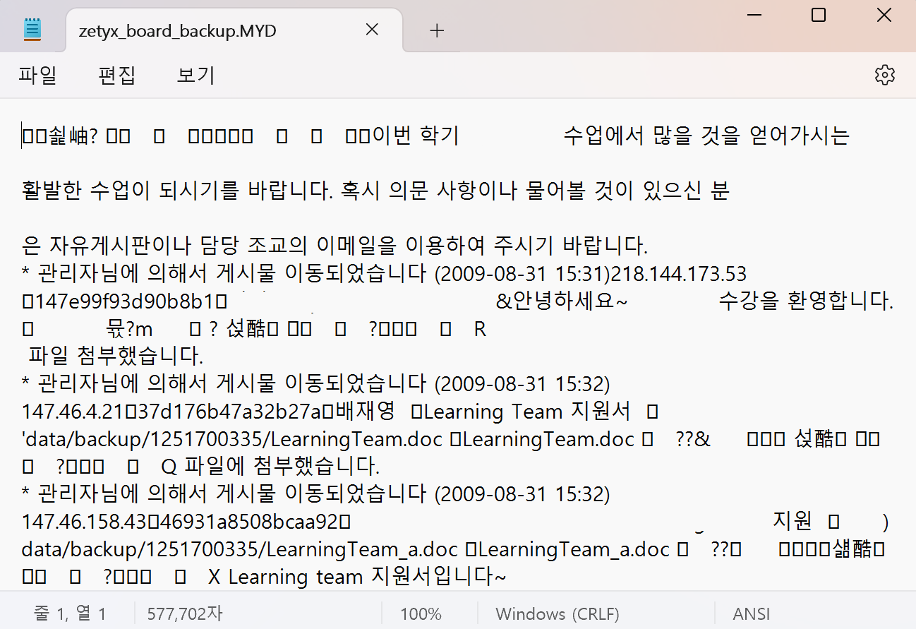 열어보니 .MYD 데이터는 notepad로도 확인할 수 있었다. 파일 형식이 정확이 어떻게 되는지는 모르겠지만 간간히 공지내용이 보존돼 있는 것을 확인할 수 있다.