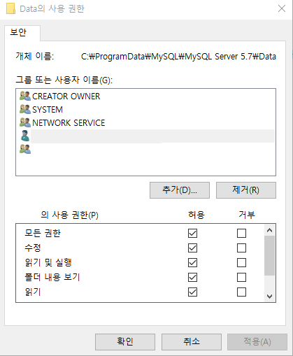 C:\ProgramData\MySQL\MySQL Server 5.7\Data\3에 들어가 쓰기 권한 설정을 해준다. 경로는 SHOW VARIABLES LIKE 'datadir';로도 확인할 수 있다. 이 경로는 MySQL의 데이터가 저장되는 위치인데, 일반적으로 사용자는 값을 변경할 수 없게 되어있다. 쓰기 권한을 허용해주자.4