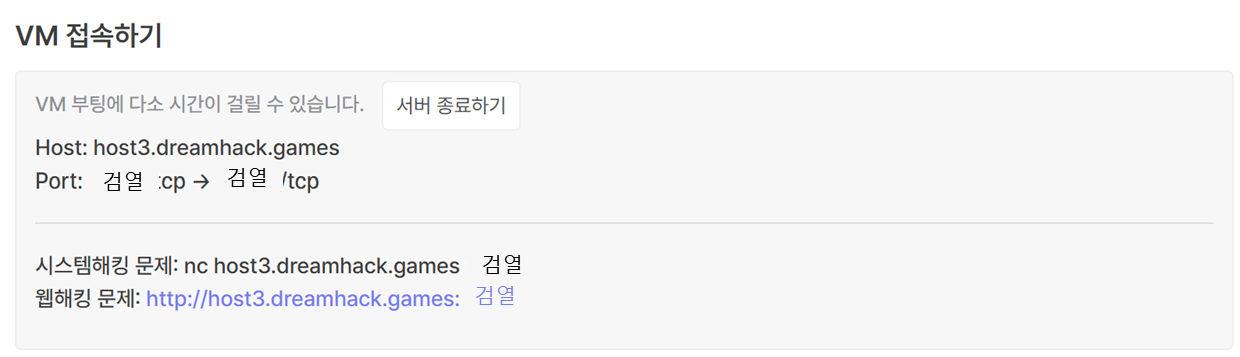 한편, 서버를 생성하면 아래 예시처럼 서버 위치가 표시됩니다. 이 문제는 시스템 해킹 문제이므로, 시스템 해킹 문제: 라고 적힌 위치로 접근합니다.