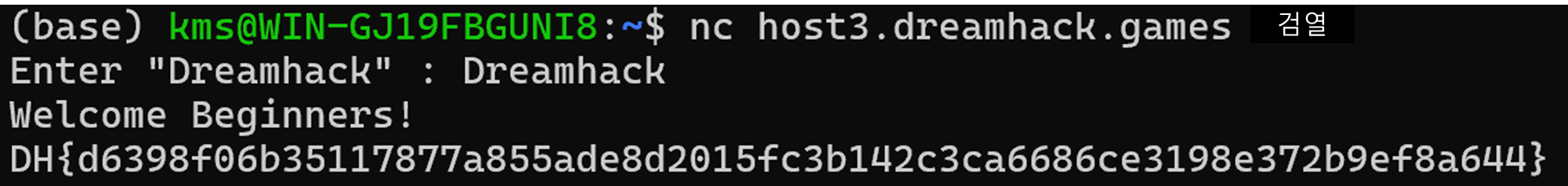 nc host3.dreamhack.games ${포트번호}이후 Enter "Dreamhack": 이라는 문자열이 나타납니다. Dreamhack을 입력합니다. Dreamhack을 입력하니 flag가 나타납니다.