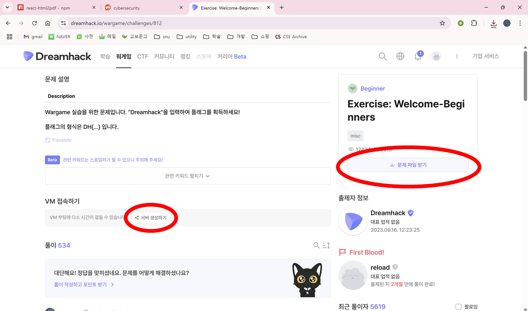 Dreamhack.io에 회원가입합니다. 들어가서 사이트를 구경합니다. 뭔가 보안 문제가 많이 있습니다. 백준처럼 티어 시스템도 있나 봅니다.