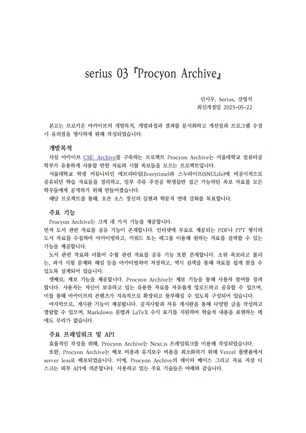 본고는 프로젝트 Procyon Archive의 개발목적, 개발과정과 결과를 문서화하고 개선점과 프로그램 수정 시 유의점을 명시하게 위해 작성되었습니다.