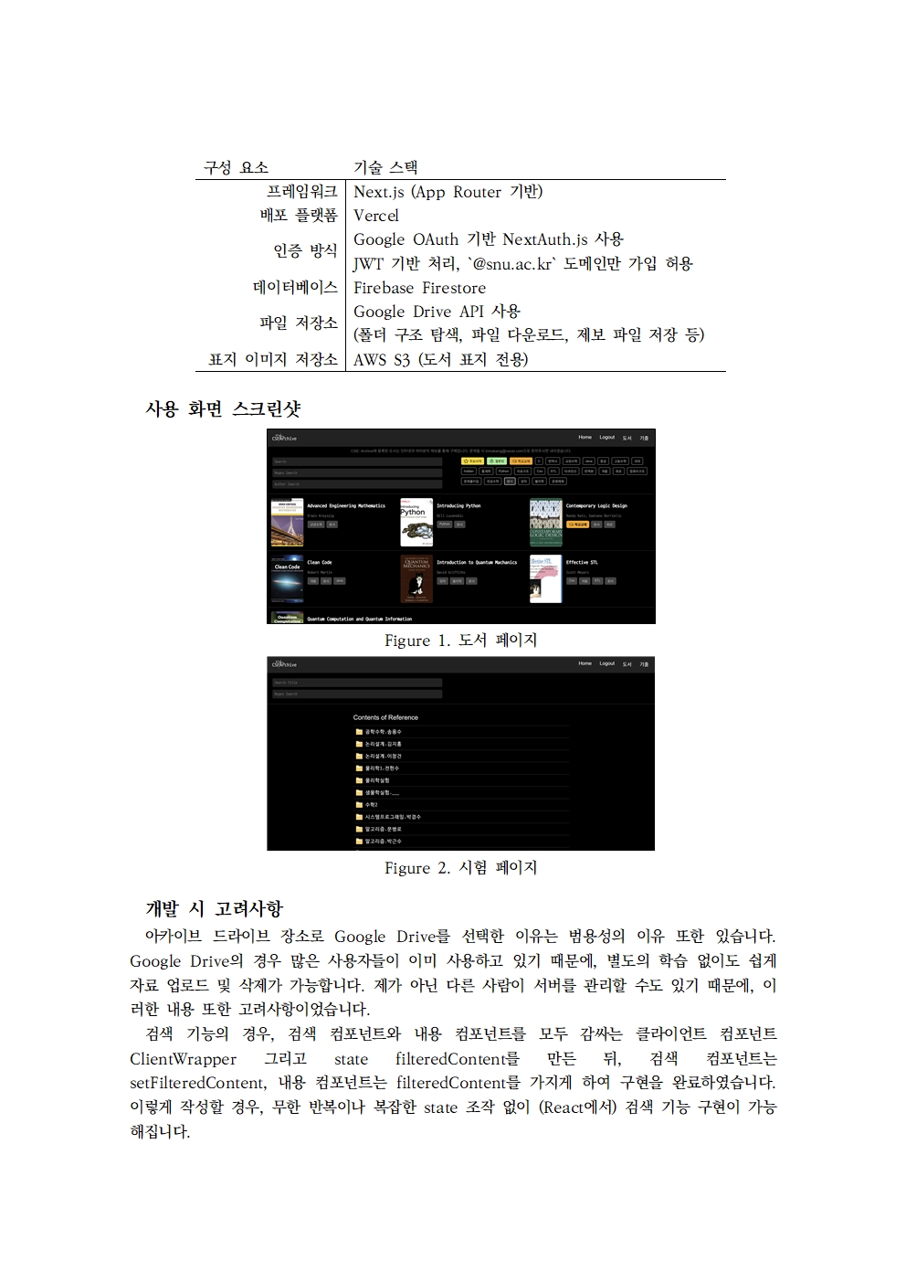 본고는 프로키온 아카이브의 개발목적, 개발과정과 결과를 문서화하고 개선점과 프로그램 수정 시 유의점을 명시하게 위해 작성되었습니다. 개발목적 사설 아카이브 CSE: Archive를 구축하는 프로젝트 Procyon Archive는 서울대학교 컴퓨터공 학부가 유용하게 사용할 만한 자료와 시험 족보들을 모으는 프로젝트입니다. 서울대학교 학생 커뮤니티인 에브리타임(Everytime)과 스누라이프(SNULife)에 비공식적으로 공유되던 학습 자료들을 정리하고, 일부 주류 주전공 학생들만 접근 가능하던 족보 자료를 모든 학우들에게 공개하기 위해 만들어졌습니다. 해당 프로젝트를 통해, 오픈 소스 정신의 실현과 학문적 연대 강화를 목표합니다. 주요 기능 Procyon Archive는 크게 네 가지 기능을 제공합니다. 먼저 도서 관련 자료를 공유 기능이 존재합니다. 인터넷에 무료로 제공되는 PDF나 PPT 형식의 도서 자료를 수집하여 아카이빙하고, 키워드 또는 태그를 이용해 원하는 자료를 검색할 수 있는 기능을 제공합니다. 도서 관련 자료와 더불어 수험 관련 자료를 공유 기능 또한 존재합니다. 소위 족보라고 불리 는, 과거 시험 문제와 해설 등을 아카이빙하여 저장하고, 역시 검색을 통해 자료를 쉽게 찾을 수 있도록 설계되어 있습니다. 셋째로, 제보 기능을 제공합니다. Procyon Archive는 제보 기능을 통해 사용자 참여를 장려 합니다. 사용자는 자신이 보유하고 있는 유용한 자료를 자유롭게 업로드하고 공유할 수 있으며, 이를 통해 아카이브의 콘텐츠가 지속적으로 확장되고 풍부해질 수 있도록 구성되어 있습니다. 마지막으로, 게시판 기능이 제공됩니다. 공지사항과 자유 게시판을 통해 다양한 글을 작성하고 열람할 수 있으며, Markdown 문법과 LaTeX 수식 표기를 지원하여 학술적 내용을 표현하는 데 에도 무리가 없습니다. 주요 프레임워크 및 API 효율적인 작성을 위해, Procyon Archive는 Next.js 프레임워크를 이용해 작성되었습니다. 또한, Procyon Archive는 배포 비용과 유지보수 비용을 최소화하기 위해 Vercel 플랫폼에서 server less로 배포되었습니다. 이에, Procyon Archive의 데이터 베이스 그리고 자료 저장 디 스크는 외부 API에 의존합니다. 사용하고 있는 주요 기술들은 아래와 같습니다. 구성 요소 기술 스택 프레임워크 Next.js (App Router 기반) 배포 플랫폼 Vercel 인증 방식 Google OAuth 기반 NextAuth.js 사용 JWT 기반 처리, `@snu.ac.kr` 도메인만 가입 허용 데이터베이스 Firebase Firestore 파일 저장소 Google Drive API 사용 (폴더 구조 탐색, 파일 다운로드, 제보 파일 저장 등) 표지 이미지 저장소 AWS S3 (도서 표지 전용) 개발 시 고려사항 아카이브 드라이브 장소로 Google Drive를 선택한 이유는 범용성의 이유 또한 있습니다. Google Drive의 경우 많은 사용자들이 이미 사용하고 있기 때문에, 별도의 학습 없이도 쉽게 자료 업로드 및 삭제가 가능합니다. 제가 아닌 다른 사람이 서버를 관리할 수도 있기 때문에, 이 러한 내용 또한 고려사항이었습니다. 검색 기능의 경우, 검색 컴포넌트와 내용 컴포넌트를 모두 감싸는 클라이언트 컴포넌트 ClientWrapper 그리고 state filteredContent를 만든 뒤, 검색 컴포넌트는 setFilteredContent, 내용 컴포넌트는 filteredContent를 가지게 하여 구현을 완료하였습니다. 이렇게 작성할 경우, 무한 반복이나 복잡한 state 조작 없이 (React에서) 검색 기능 구현이 가능 해집니다.