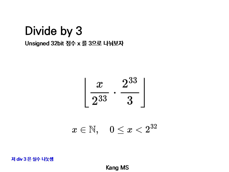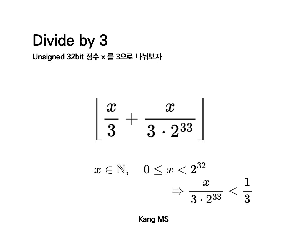 근데 이 값 또한 floor( x / 3 ) 과 같다. 전개하면 우측과 같이 되는데, x / 3 * 2^{33} 이 무조건 1/3 보다 작으므로, 정수 값을 바꿀 힘이 없다.