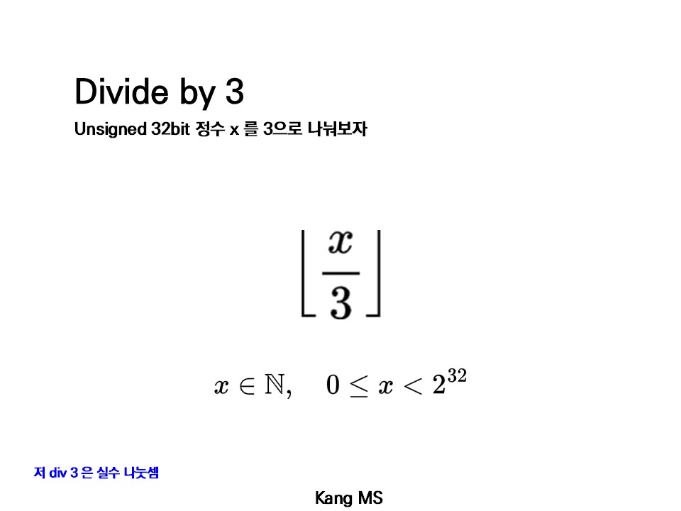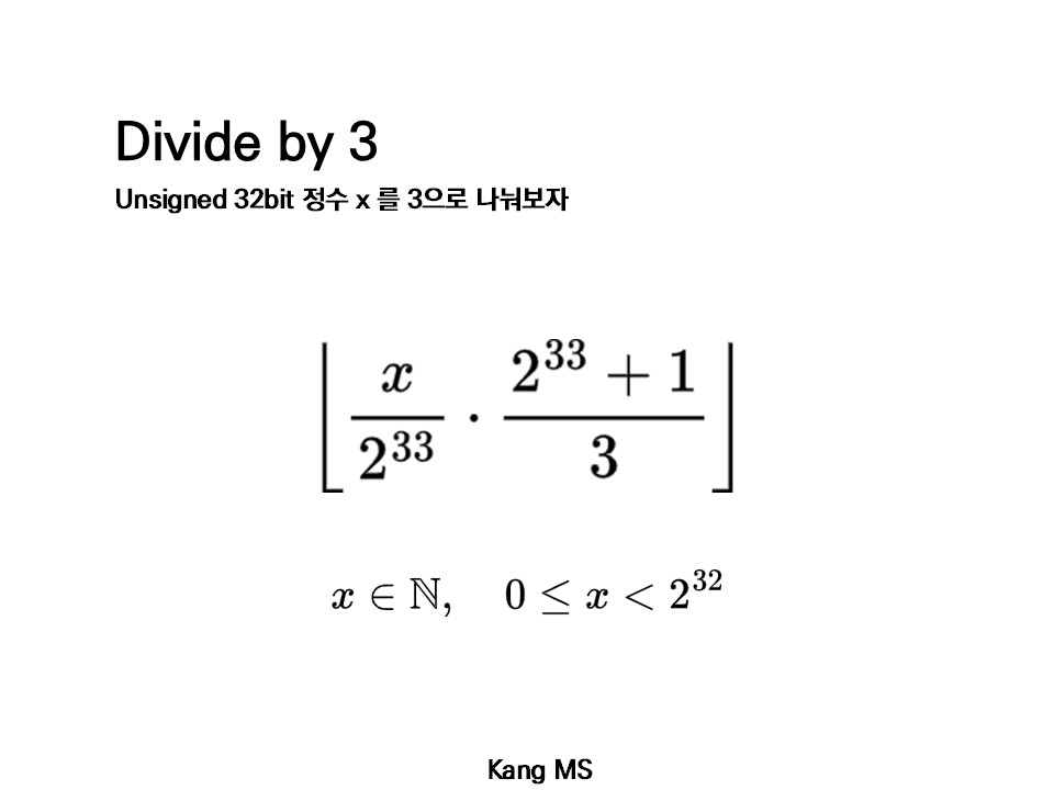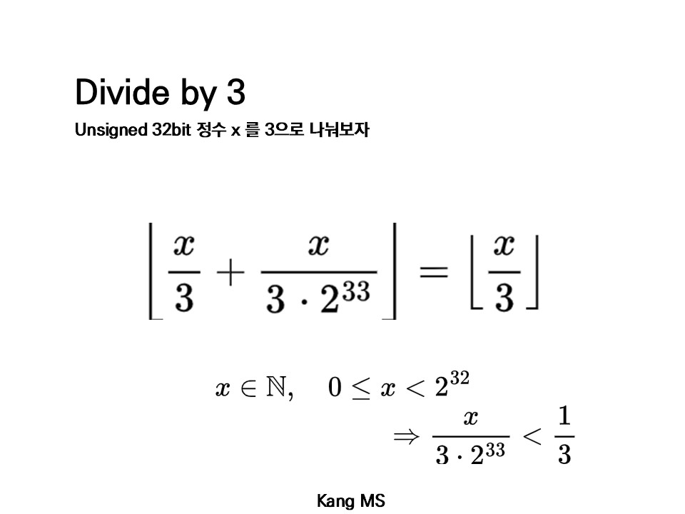 unsigned 정수 연산에서, 우리가 x / 3 을 계산할 때, 실제로 계산되는 값은 floor( x / 3 ) 이다.2 이 floor( x / 3 ) 값이 다르게 구해질 수 있음을 증명하자.