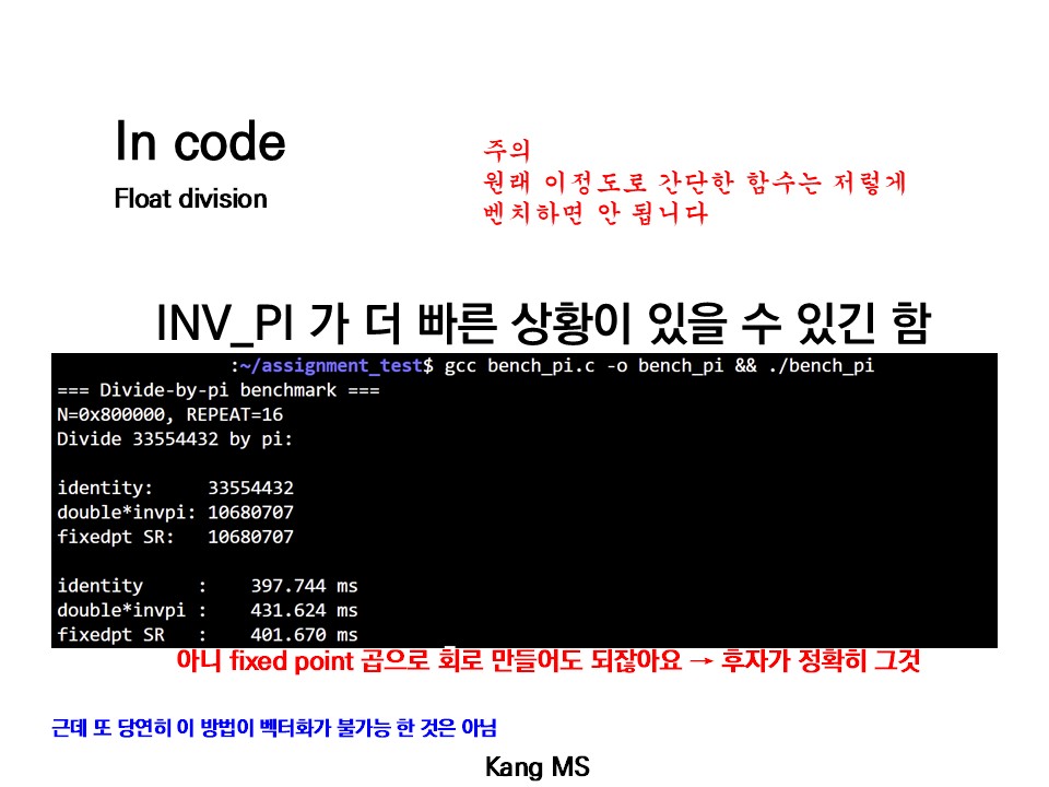 #define INV_PI = "INVERSION_VALUE_OF_PI" inlint int invpi(int x) { return x * INV_PI; }이렇게 짜면 int-double 형변환 / 부동실수곱 / double-int 형변환 이 각각 한 번씩 수행된다.