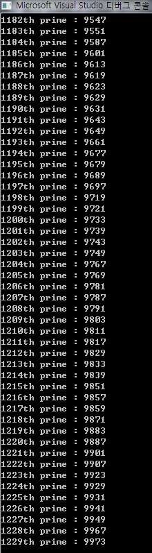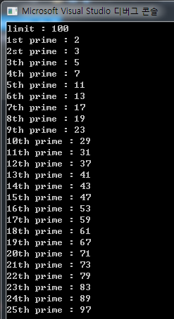 #include <iostream> #include <algorithm> #include <vector> #define TRUE 1 #define FALSE 0 using namespace std; int f(int N) { static bool C = TRUE; if (C) { N += 2; C = FALSE; } else { N += 4; C = TRUE; } return N; } int main(void) { vector<int> prime; int num, lim; bool con = FALSE; cout << "limit : "; cin >> lim; if ((lim >= 3) || (lim == -1)) { cout << "1st prime : 2" << endl; prime.push_back(2); cout << "2st prime : 3" << endl; prime.push_back(3); for (num = 5; ((num <= lim) || (lim == -1)); num = f(num)) { for (int i = 0; i < prime.size(); i++) { if (!(num % prime[i])) { con = TRUE; break; } } if (con) { con = FALSE; continue; } prime.push_back(num); cout << prime.size() << "th prime : " << num << endl; } } else { prime.push_back(2); prime.push_back(3); for (int i = 0; lim >= prime[i];) { cout << i << "th prime : " << prime[i] << endl; i++; } } return 0; }입력 : 숫자를 하나 입력